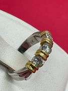 LADIES PLATINUM AND 18K GOLD DIAMOND RING. IT HAS THREE ALL NATURAL (NOT LAB CREATED) ROUND BRILLIANT CUT DIAMONDS WITH A TOTAL WEIGHT OF 0.60 CARAT. DIAMONDS ARE E-F COLOR AND VS CLARITY. BAND IS 4.2 MM WIDE.SIZE IS 5-CAN EASILY GET RESIZED BY YOUR LOCAL JEWELER. WEIGHT IS 5.9 GRAMS. STAMPED: PLATINUM; 18K. CAN BE USED AS A WEDDING BAND OR ANNIVERSARY RING. IN MINT CONDITION.