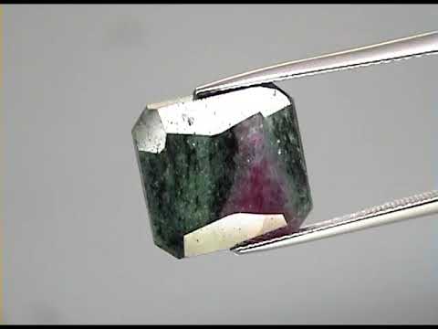 Holy color palettes, Batman! This amazing ruby in zoisite displays two very rich and well defined color palettes with its violet red ruby set against pine green with swirling black highlights, creating one amazing gemstone. This piece is very well cut with a classic emerald shape, and every facet is covered with a beautifully polished shimmering luster. It measures an impressive 13.8mm x 13.3mm x 9mm, so you know no one is going to miss it when worn. This gemstone is all natural, with no dyes or fillers, just pure ruby trapped in zoisite. Sourced from Winza, Tanzania.