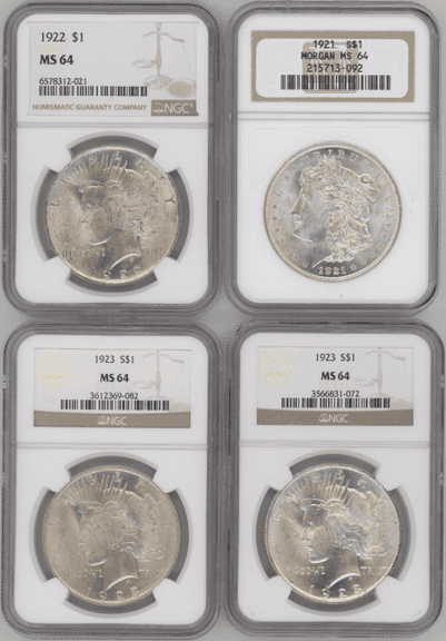 Great foursome of near Gem BU Silver Dollars in PCGS MS64 holders: 1921 Morgan, and 1922, 1923, & 1924 Peace Silver Dollars.