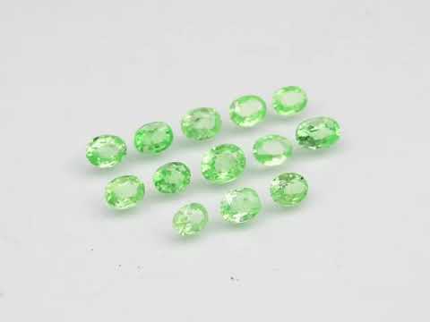 This 13 piece collection exhibits outstanding natural spring green hues with vivid saturation with some serious weight. The fully transparent bodies of these VS to SI clarity tsavorites is complimented by their diamond lusters that twinkle off of every facet. Measuring 3.8x3mm to 5x3.8mm each, this substantial gemstone parcel is ready to set. Only 10 percent of the tsavorite mined in the world is above 1 carat, with only 2.5 percent being over 2 carats. Made famous by Tiffany and Co., this very beautiful gem is held in high regard by collectors and connoisseurs. Sourced from Tanzania.