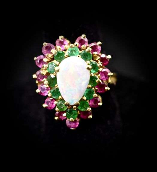 Oval Opal Cabochon and Multi-Gemstone Double Frame Cocktail Ring in 14K Yellow gold. Opal Dimensions: Approx. 10.0 X 17.0 MM. Ring Face Dimensions: Approx. 19.0 X 24.0 MM. Ring Size: 11.25 (US). Weight: Approx. 9.90 Grams. Stamped: 14K.