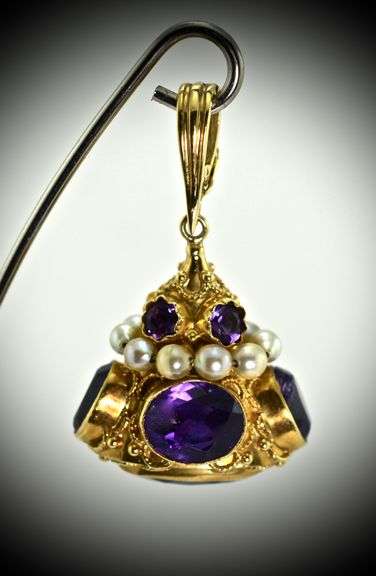 Antique 18K Yellow Gold Fob with Amethysts and Pearls