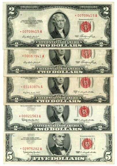 Great lot of 5 nice Red Seal STAR Notes. 4 $2 and 1 $5.