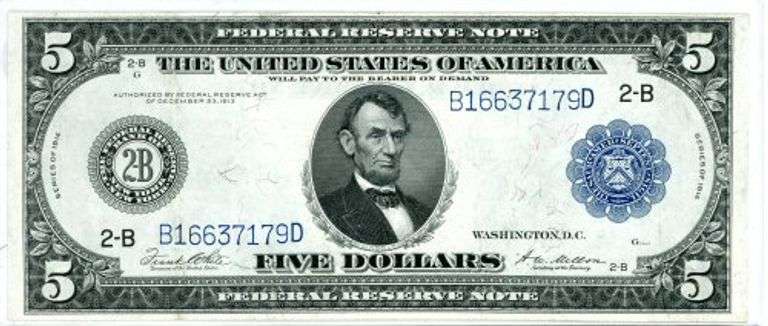 Crisp Uncirculated 1914 Series Large Size $5 Federal Reserve Note (2-B)