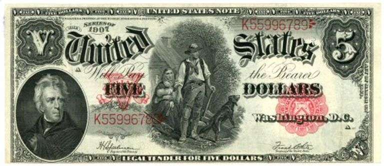 Super nice nearly brand new 1907 Large Size $5 Woodcutter Note