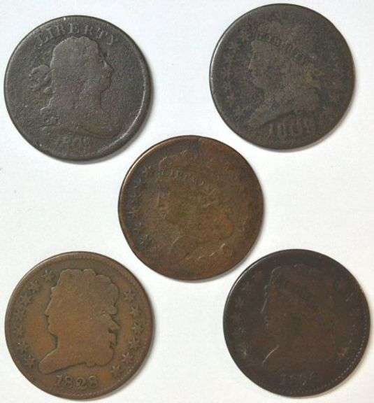 Run of 5 different US Half Cents 1808 to 1828 in circ