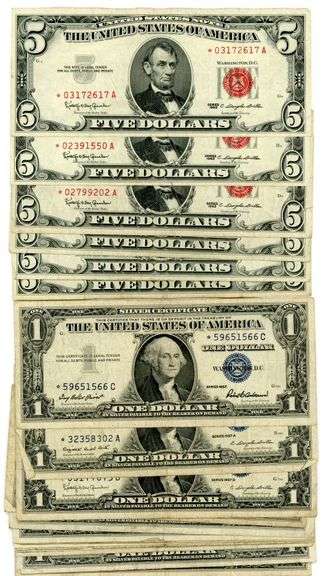 28 Superb Gem CU $1 Silver Certificate STAR Notes from the Series of 1957-A all in sequence with consecutive serial numbers.