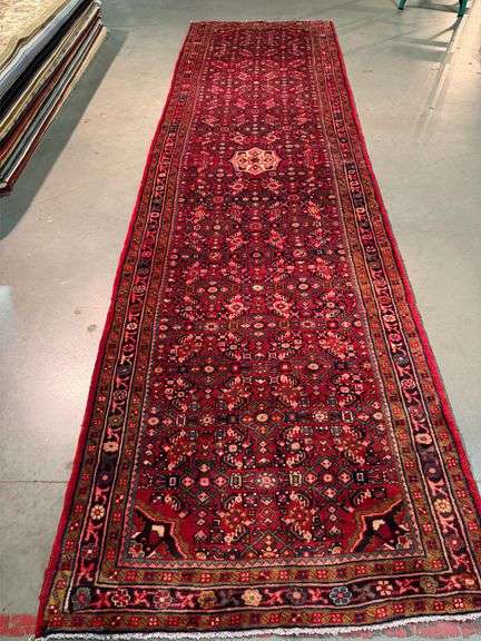 | 3'.9"X 10'.7" Fine Authentic Persian Heriz Runner Geometric pattern in ivory, red rust and multi accent colors. Excellent condition Vege dye Hand Knotted in Iran 100% Natural wool pile |