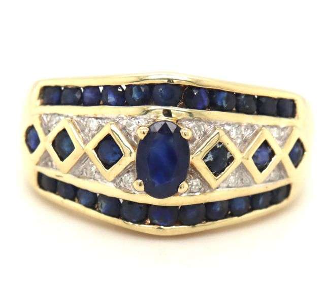 14kt Yellow gold diamond pave and blue sapphire woven ring. The total weight of the ring is 6.50 grams. Ring size 6".