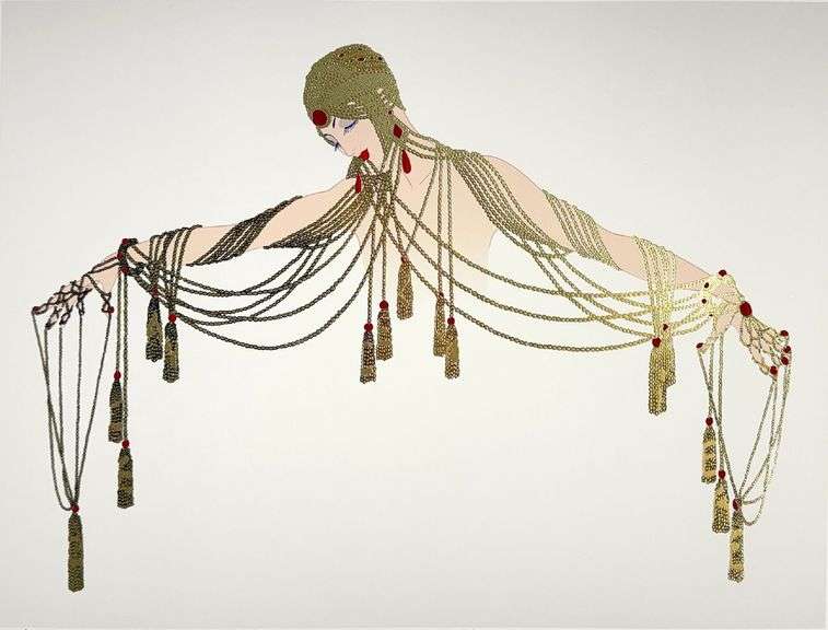 Highly collectible serigraph in colors with foil stamping and embossment on wove paper by Erte from 1987. This work is signed and numbered in pencil from the limited edition of 300. Comes with a certificate of authenticity