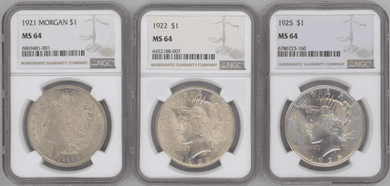 2 Near Gem BU 1921 Morgan Silver Dollars. PCGS & NGC MS64